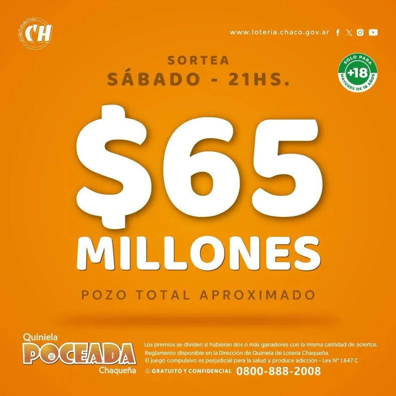 Tras quedar vacante el jueves por la noche, la Poceada Chaqueña acumula un pozo aproximado de 65 millones de pesos para este sábado. El sorteo tendrá lugar alrededor de las 21 horas.