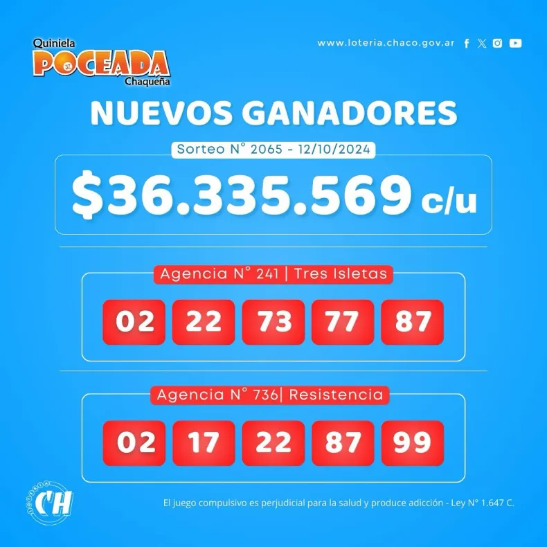 Cada uno de los afortunados se llevó un premio de 36.365.569 pesos. El apostador de Tres Isletas ganó con la combinación 02, 22, 73, 77 y 87, mientras que el de Resistencia lo hizo con los números 02, 17, 22, 87 y 99.
