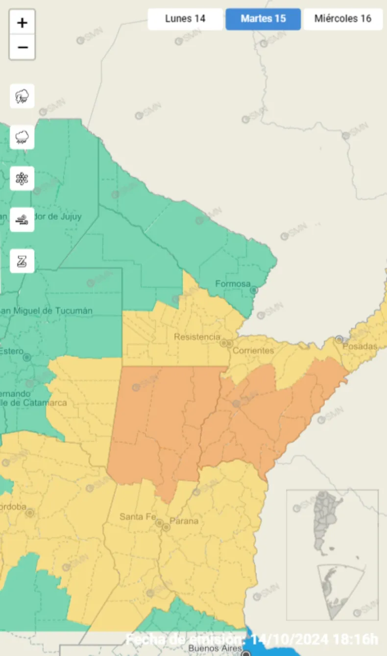 De acuerdo a lo informado por el SMN, el alerta rige para los departamentos Bermejo, General Donovan, Libertad, 1° de Mayo, San Fernando, Chacabuco, Comandante Fernández, 12 de Octubre, 2 de Abril, Fray Justo Santa María de Oro, General Belgrano, Independencia, Libertador General San Martín, Mayor Luis Jorge Fontana, 9 de Julio, O"Higgins, Presidencia de la Plaza, Quitilipi, San Lorenzo, Sargento Cabral, Tapenagá y 25 de Mayo. De acuerdo al informe, las lluvias iniciarían en las primeras horas de la mañana.