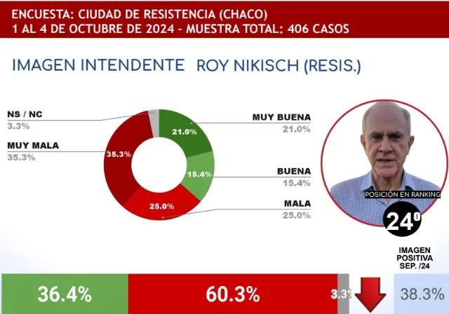 En relación al ranking de jefes comunales, Roy Nikisch está en la última posición, es decir, es el intendente con peor valoración positiva según el ranking. Según el listado dado a conocer por CB, Los peores calificados de este mes son: Nikisch de Resistencia con 36.4% de aprobación, seguido por Walter Cortés de Bariloche con 36.6% y Pablo Grasso de Río Gallegos con 37.9% de imagen positiva.