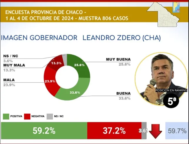 De acuerdo al relevamiento realizado por la Consultora CB que evalúa mes a mes la imagen positiva de los gobernadores del país, el mandatario chaqueño cayó al quinto lugar del ranking, aunque se mantiene en el grupo de ocho representantes con opinión favorable. Según el estudio, Zdero alcanzó el 59,2% de imagen positiva, mientras que el 37,2% fue negativa.