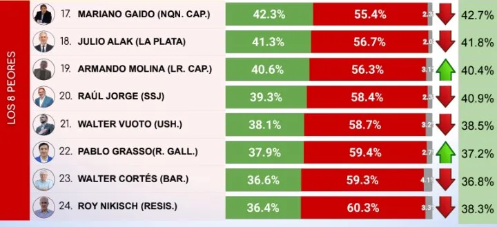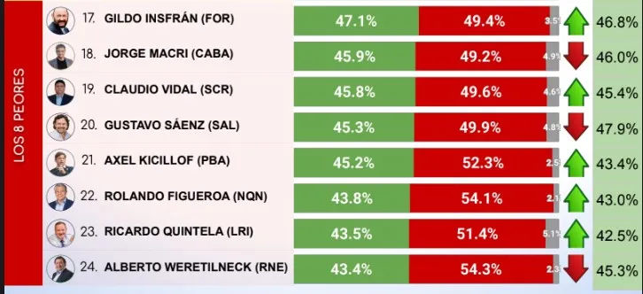 Asimismo, manifiesta que los peores calificados de este mes son: Alberto Weretilneck (Río Negro) con 43.4% de aprobación en último lugar, seguido por Ricardo Quintela con 43.5% y Rolando Figueroa (Neuquén) con 43.8% de imagen positiva.