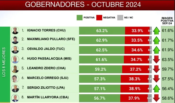 El índice expresa que, Los tres gobernadores mejores valorados del mes de octubre 2024 por sus co-provincianos son: En primer lugar Ignacio Torres (Chubut) con 63.2% de aprobación, seguido por Maximiliano Pullaro (Santa Fe) con 62.9%, y cierra este podio Osvaldo Jaldo (Tucumán) con 62.5% de imagen positiva.