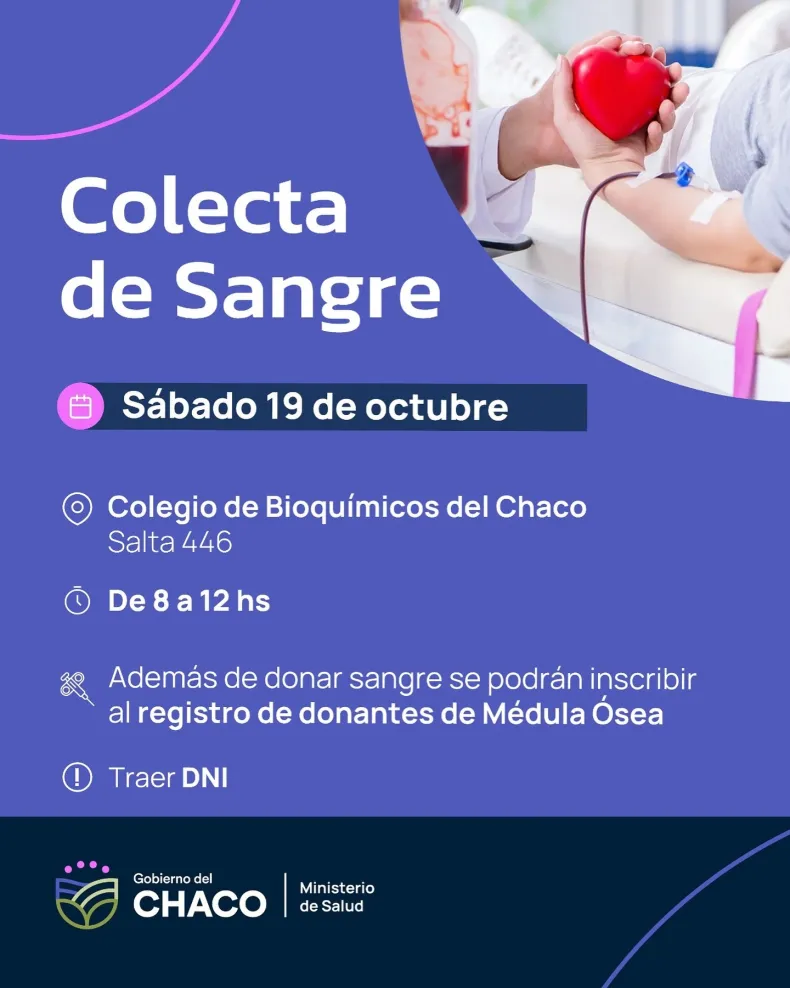 Este sábado 19 de octubre se realizará una nueva colecta externa de sangre e inscripción de donantes de médula ósea en el Colegio de Bioquímicos del Chaco, ubicado en Salta 446. La jornada se llevará a cabo de 8 a 12 hs, y quienes deseen participar deberán llevar su DNI.