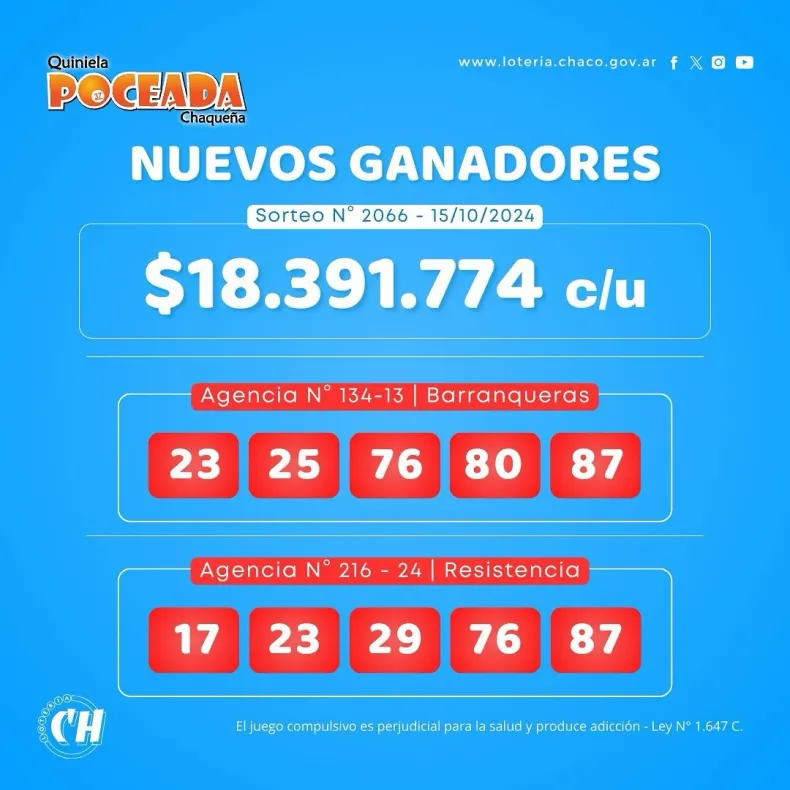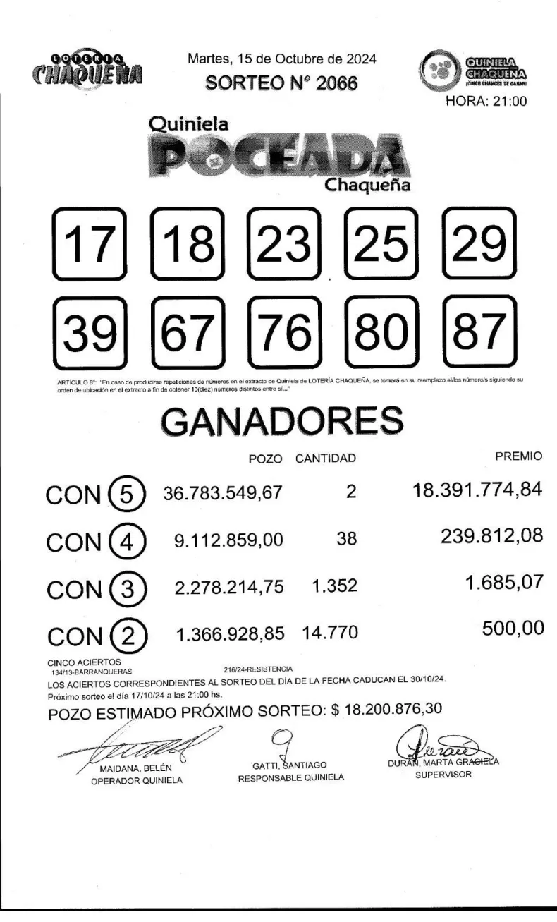 El apostador de Barranqueras ganó con la combinación 23,25,76,80 y 87, mientras que el de Resistencia lo hizo con los números 17,23,29,76,87