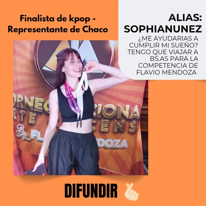 Sophia Núñez se comunicó con este medio a través de Comunidad TAG (3624 393128), ella es una talentosa bailarina de 16 años con más de 11 años de experiencia en danza y se convirtió en la única finalista de K-POP de la provincia en la competencia de Flavio Mendoza. La final se llevará a cabo el 7 y 8 de diciembre en el Circo de Flavio en Tecnópolis, Buenos Aires. Sin embargo, la joven enfrenta el desafío de costear los gastos de viaje y estadía.