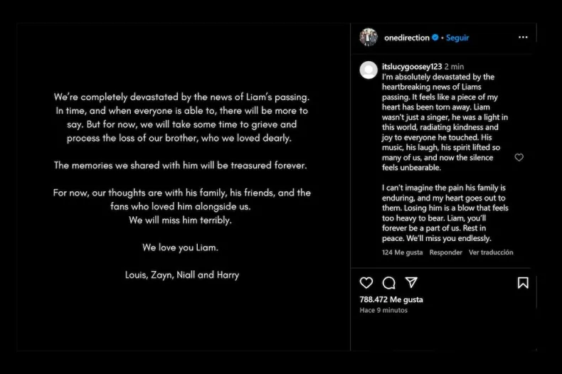 "Estamos completamente devastados por la noticia de la muerte de Liam. En su momento, y cuando todos seamos capaces de hacerlo, habrá más que decir. Pero por ahora, nos tomaremos un tiempo para llorar y procesar la pérdida de nuestro hermano, a quien queríamos profundamente", expresa el comunicado de los exmiembros Zayn Malik, Niall Horan, Harry Styles y Louis Tomlinson.
