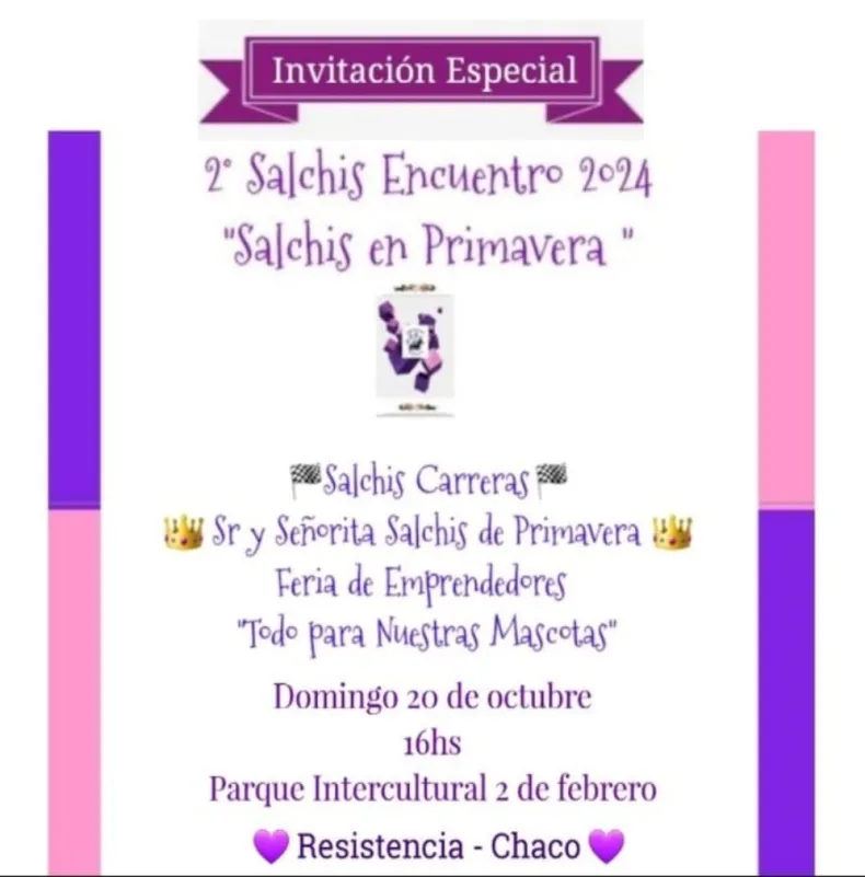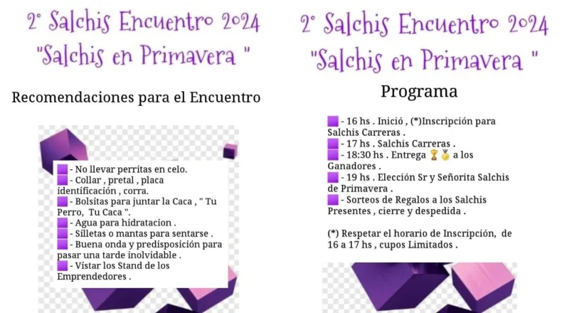 "Salchis en primavera" será la temática de la reunión que tendrá como una de las principales actividades a las "Salchis carreras". Las mismas serán con inscripción previa con cupos limitados y contarán con tres categorías: Salchis bebés (de 3 meses a un año), Salchis general (de un año en adelante) y Salchis Amigos (para otras razas pequeñas o medianas).
