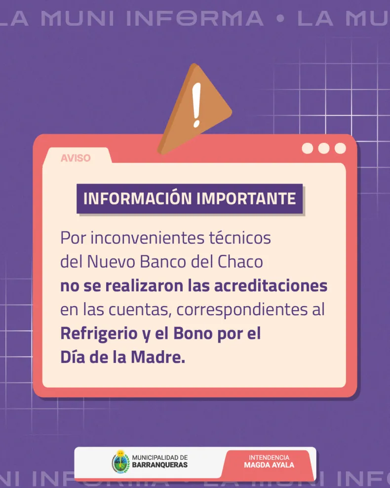 La Municipalidad de Barranqueras informó que, debido a un inconveniente técnico en el Nuevo Banco del Chaco (NBCH), no se acreditaron los montos correspondientes al refrigerio y al bono especial por el Día de la Madre en las cuentas de los trabajadores municipales.