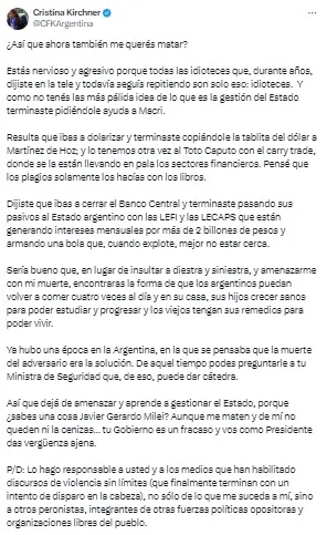 - "Ya hubo una época en la Argentina, en la que se pensaba que la muerte del adversario era la solución. De aquel tiempo podes preguntarle a tu Ministra de Seguridad que, de eso, puede dar cátedra. Así que dejá de amenazar y aprende a gestionar el Estado, porque ¿sabes una cosa Javier Gerardo Milei? Aunque me maten y de mí no queden ni las cenizas… tu Gobierno es un fracaso y vos como Presidente das vergüenza ajena".