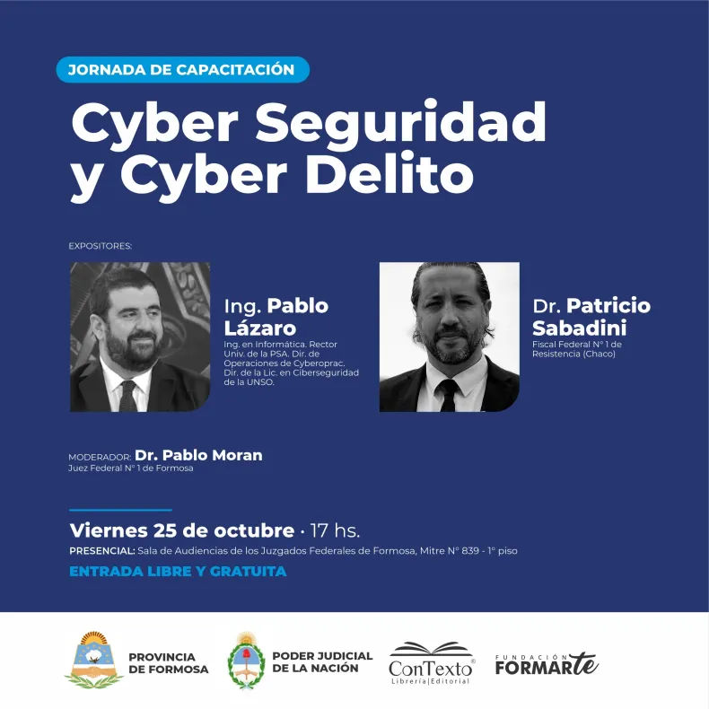 Este viernes a las 17 horas se llevará a cabo la jornada de capacitación en Cyber Seguridad y Cyber Delito impulsada por el Poder Judicial de la Nación, cuyos disertantes serán el fiscal federal Dr. Patricio Sabadini y el ingeniero en informática Pablo Lázaro.