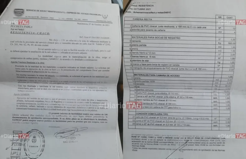 Ante esto, la mujer acercó los reclamos a las oficinas de Sameep en varias ocasiones. Sin embargo, relató que desde la empresa le respondieron que no cuentan con el presupuesto suficiente para realizar dicha obra y le sugirieron que aporte con "la totalidad de los materiales", incluyendo los necesarios en caso de "la rotura de calzadas pavimentadas", para realizarla.