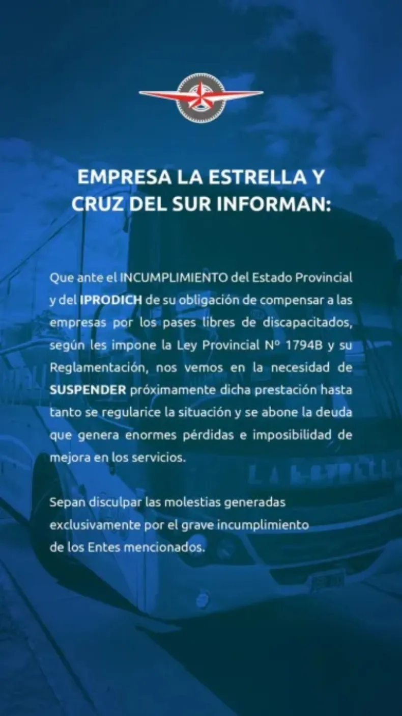La información fue compartida por las empresas "La Estrella" y "Cruz del Sur" mediante un comunicado en el que responsabilizaron el "incumplimiento del Estado Provincial y del IPRODICH de su obligación de compensar a las empresas en los pases libres de discapacitados, según les impone la ley provincial 1794 B y su reglamentación" y que se ven en "la necesidad de suspender próximamente dicha prestación hasta tanto se regularice la situación y de abone la deuda que genera enormes pérdidas e imposibilidad de mejora en los servicios".