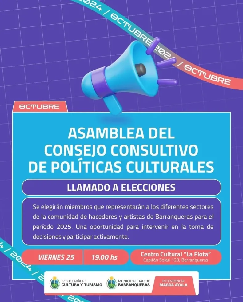 La Municipalidad de Barranqueras, a través de la Secretaría de Cultura y Turismo, convocó a una asamblea para elegir a los nuevos integrantes del Consejo Consultivo de Políticas Culturales. La elección se realizará el próximo viernes 25 de octubre a las 19 horas en el Centro Cultural "La Flota", ubicado en Capitán Solari 123.