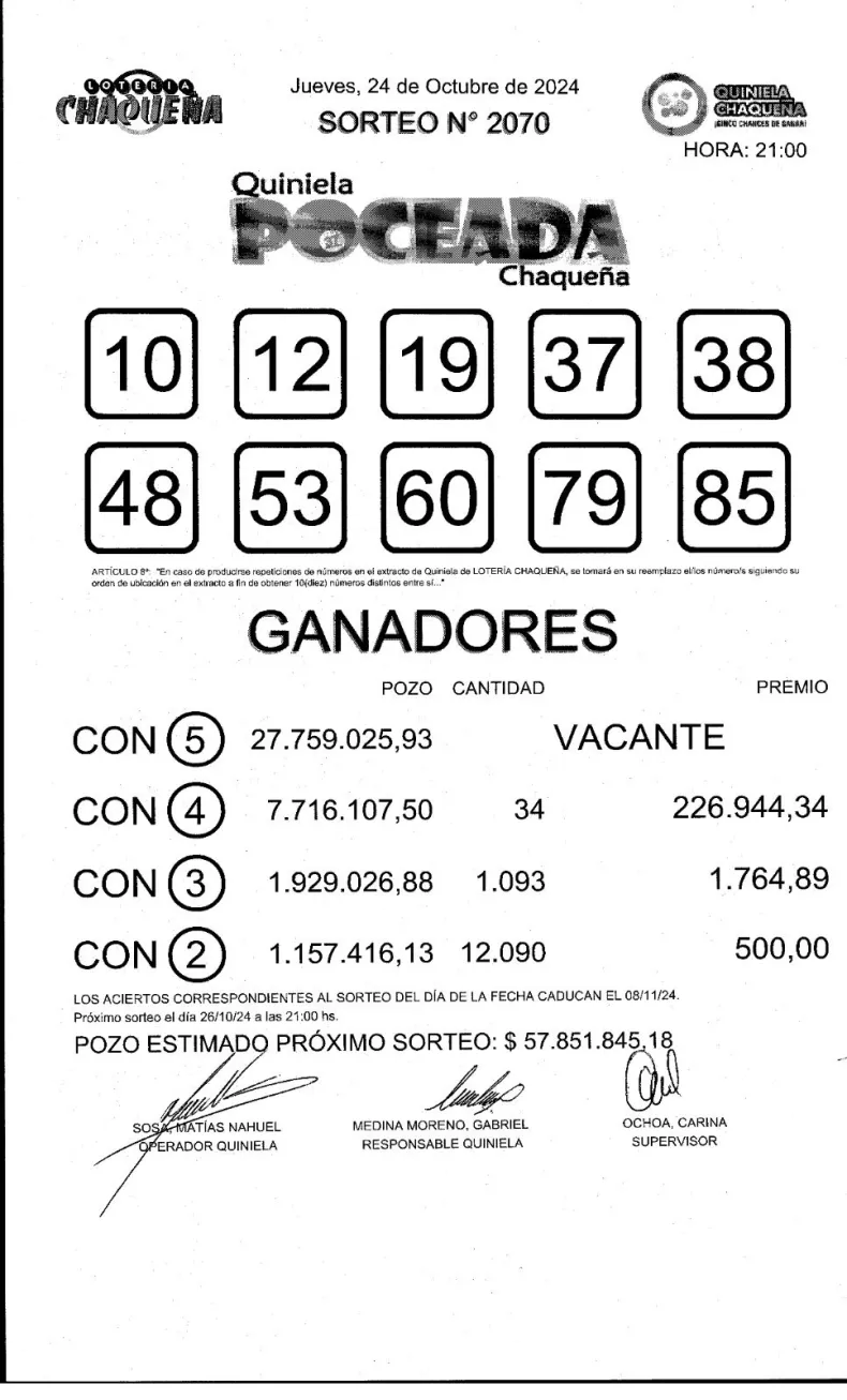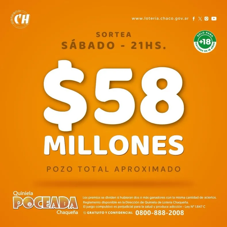 El jueves por la noche se realizó el sorteo N°2070 de la Poceada Chaqueña y su pozo quedó vacante para este sábado. Por este motivo, se estima un pozo acumulado de 58 millones de pesos para el fin de semana.