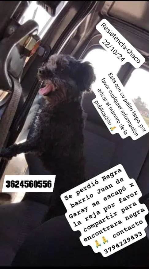 Una familia de Resistencia busca intensamente a su perra "Negra", una caniche negra de pecho blanco y cola corta, que desapareció el 22 de octubre en el barrio Juan de Garay. Los dueños de la mascota, quienes la adoptaron en 2018, sospechan que pudo haber sido robada por los ocupantes de una camioneta azul que fue vista cerca de la casa el día en que desapareció.