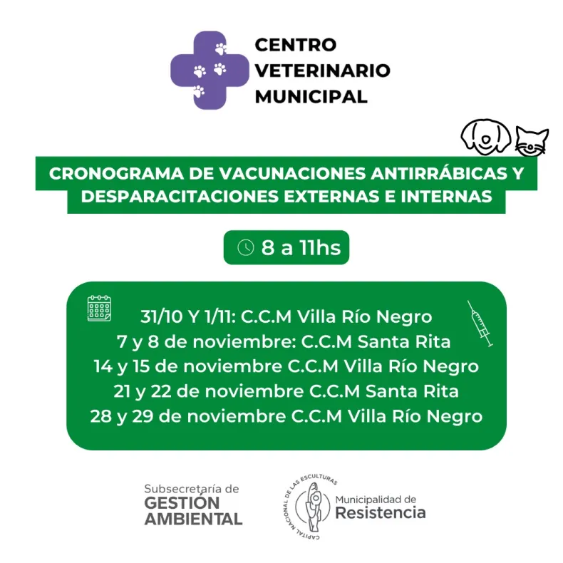 El Centro Veterinario Municipal de Resistencia invita a la comunidad a participar en una jornada de vacunación antirrábica y desparasitación gratuita para perros y gatos. Esta iniciativa tiene como objetivo promover la salud y el bienestar de las mascotas en la región.