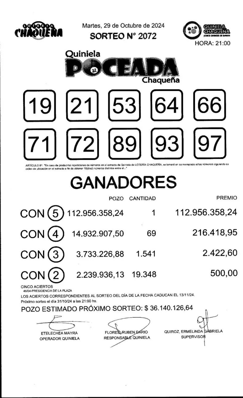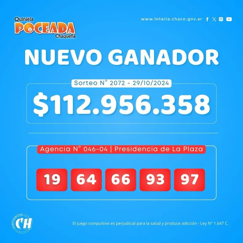 El apostador de Presidencia de La Plaza ganó con la combinación 19,64,66,93,97. Es así, que el jugador tiene hasta el 13 de noviembre de 2024 para reclamar su premio en las agencias de Lotería Chaqueña. Los demás números sorteados fueron: 71,72,89,53 y 21.