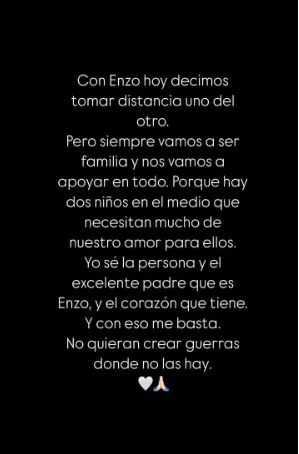 La separación generó diversas especulaciones, incluidas posibles terceros involucrados. Sin embargo, según la periodista Julieta Argenta, Cervantes desmintió haber encontrado pruebas de infidelidad y aclaró que la decisión fue tomada por Enzo, quien le manifestó su deseo de vivir una etapa diferente de su vida.