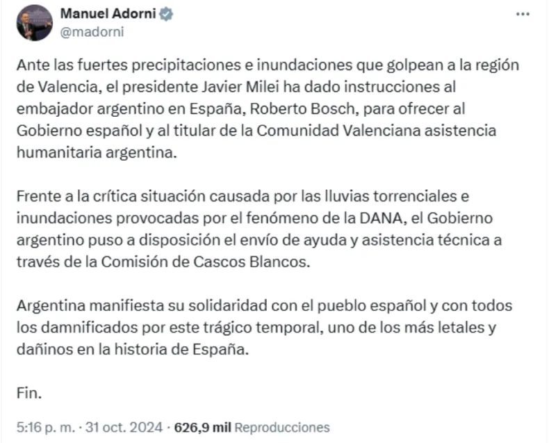 "Frente a la crítica situación causada por las lluvias torrenciales e inundaciones provocadas por el fenómeno de la DANA, el Gobierno argentino puso a disposición el envío de ayuda y asistencia técnica a través de la Comisión de Cascos Blancos", detalló el vocero presidencial Manuel Adorni en su cuenta de la red social X.