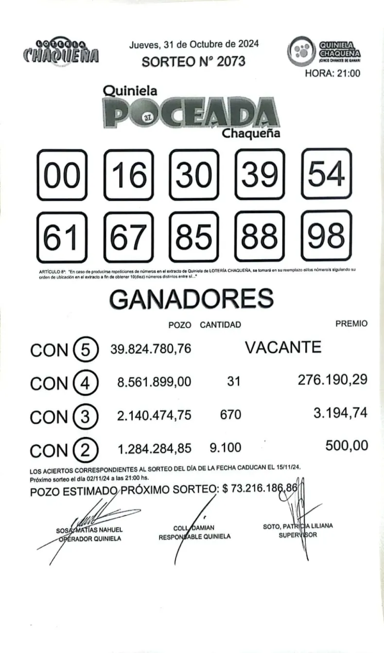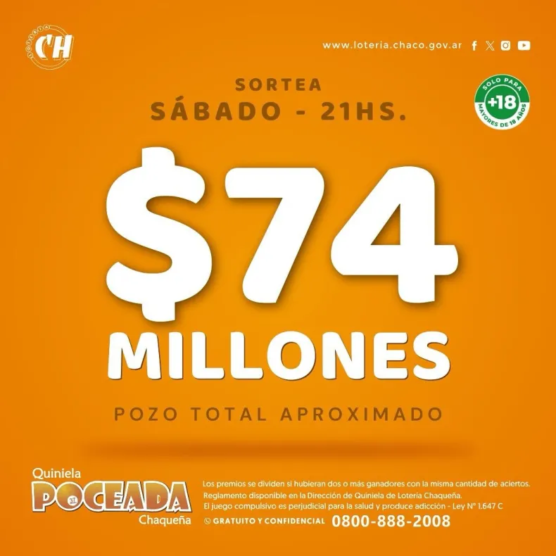 En el último sorteo del día jueves 31 de octubre, la Poceada chaqueña no encontró ganador para el primer premio y se acumuló un pozo de $ 74 millones.