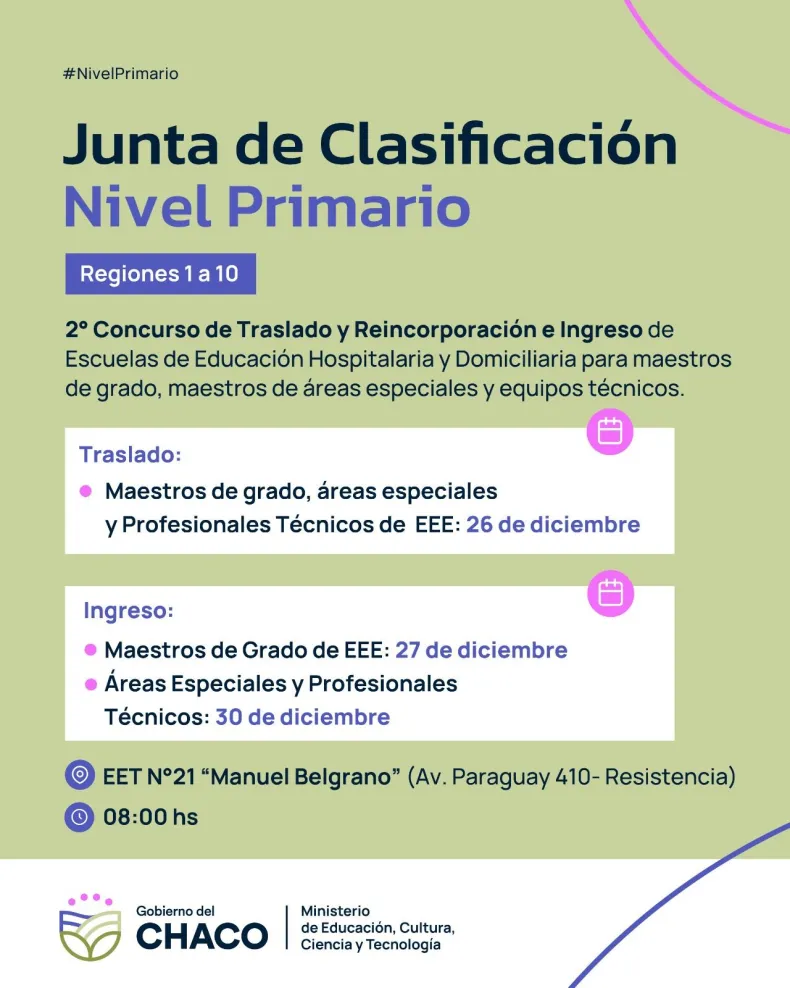 El Ministerio de Educación, a través de las Juntas de Clasificación del Nivel Primario para las Regiones 1 a 10, ha anunciado la fecha del 2° Concurso de Traslado, Reincorporación e Ingreso de Escuelas de Educación Hospitalaria y Domiciliaria. Este concurso está destinado a maestros de grado, maestros de áreas especiales y equipos técnicos.