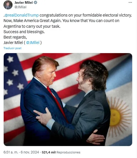 La traducción al posteo expresa: "Ahora, Make America Great Again. Saben que pueden contar con Argentina para llevar a cabo su tarea. Éxitos y bendiciones", cerró Milei en su saludo a Trump este miércoles.