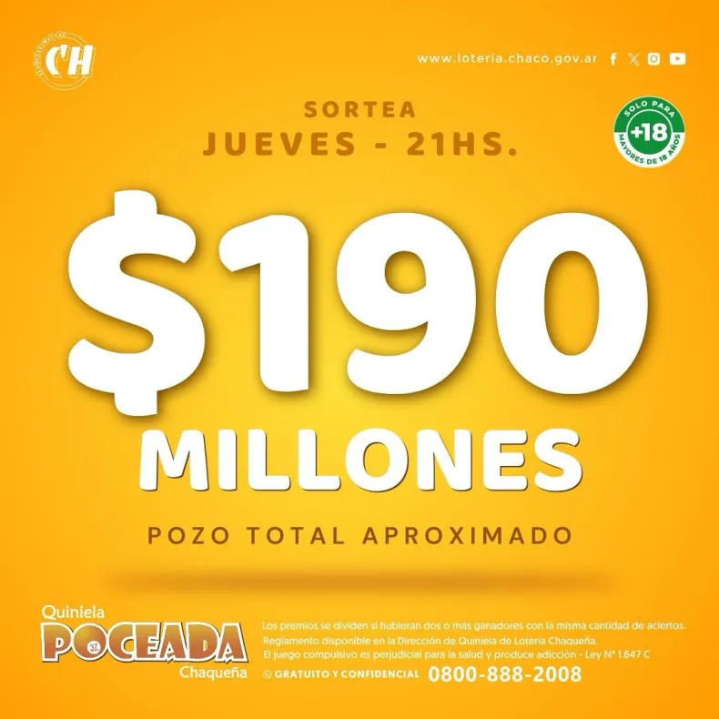 Ahora, este jueves 7 de noviembre se sortearán 190 millones de pesos a las 21 horas. Cabe resaltar que el último sorteo en el que se llevaron el premio grande fue el 30 de octubre, cuando un afortunado de Presidencia de la Plaza se llevó $ 113 millones.