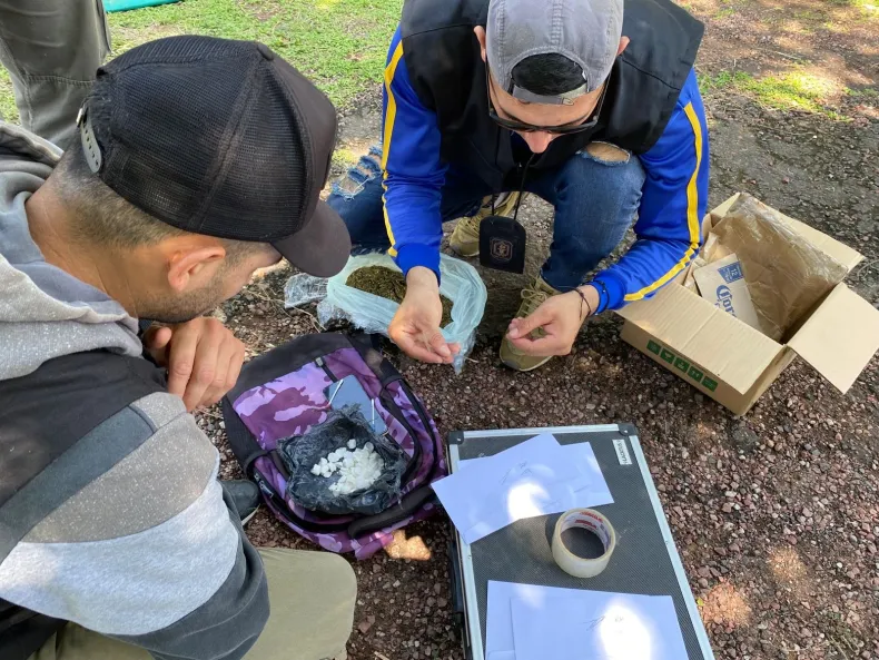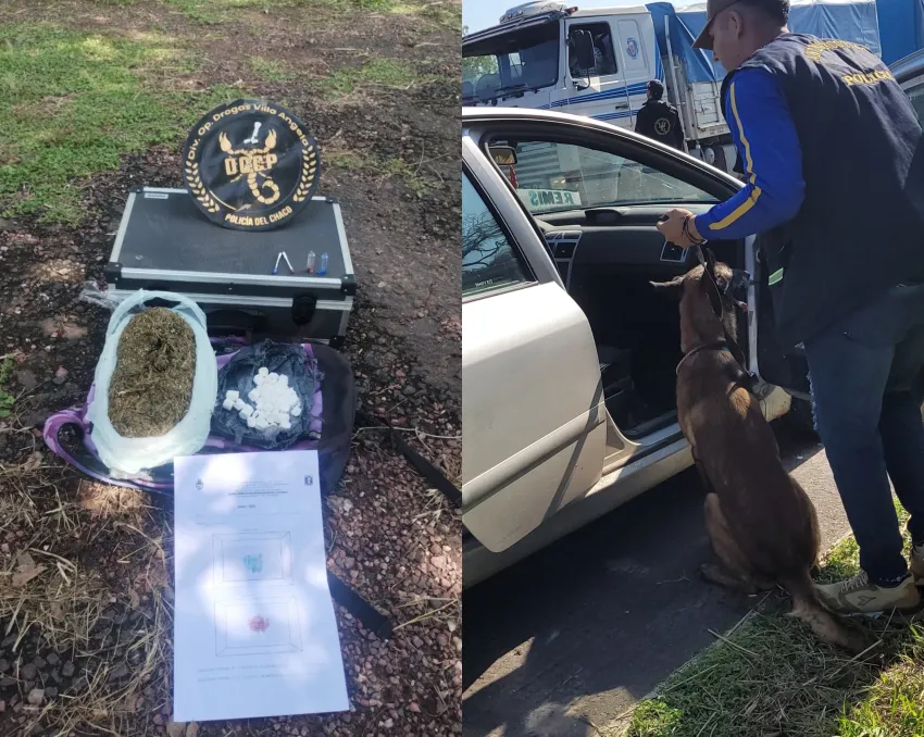 El can "Obba" logró detectar las drogas que se encontraban dentro de una mochila. En el lugar, secuestraron 1.029 kilos de marihuana, 104 gramos de cocaína, un celular y el rodado con el que circulaba. El fiscal de turno dispuso que el demorado sea notificado de aprehensión en la causa de "supuesta infracción a la ley N°23.737 de estupefacientes".