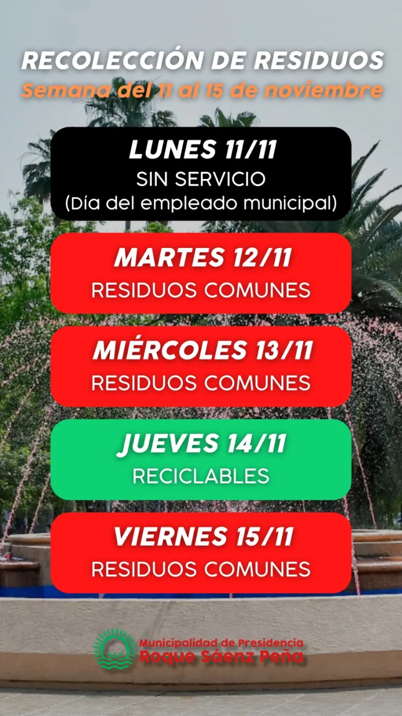 Atento a que este año el asueto por el Día del Empleado Municipal pasa para el lunes 11 de noviembre, ese día no habrá recolección de residuos en la ciudad de Sáenz Peña.