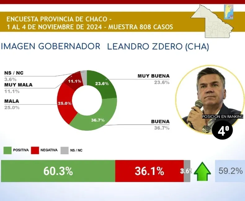 La encuesta, realizada entre el 1 y el 4 de noviembre en Chaco con una muestra de 808 personas, muestra que, a más de 11 meses de haber asumido su cargo, Zdero mantiene una aprobación superior al 60%. Su imagen positiva creció 0,8 puntos, alcanzando el 60,3%, reflejando el respaldo de una parte significativa de la población chaqueña.