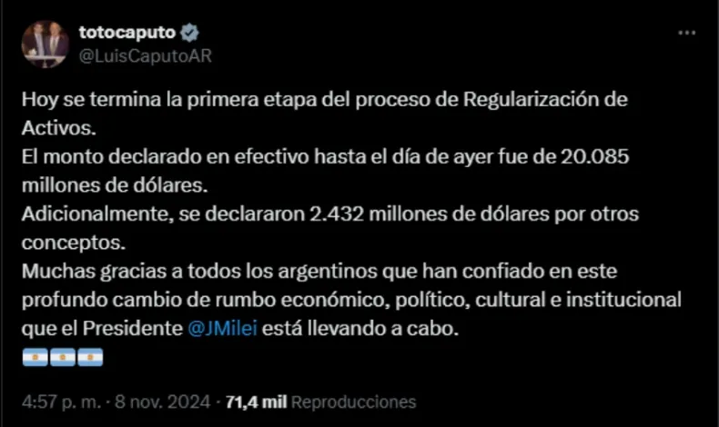 "Hoy se termina la primera etapa del proceso de Regularización de Activos. El monto declarado en efectivo hasta el día de ayer fue de 20.085 millones de dólares. Adicionalmente, se declararon 2.432 millones de dólares por otros conceptos", dijo Caputo.