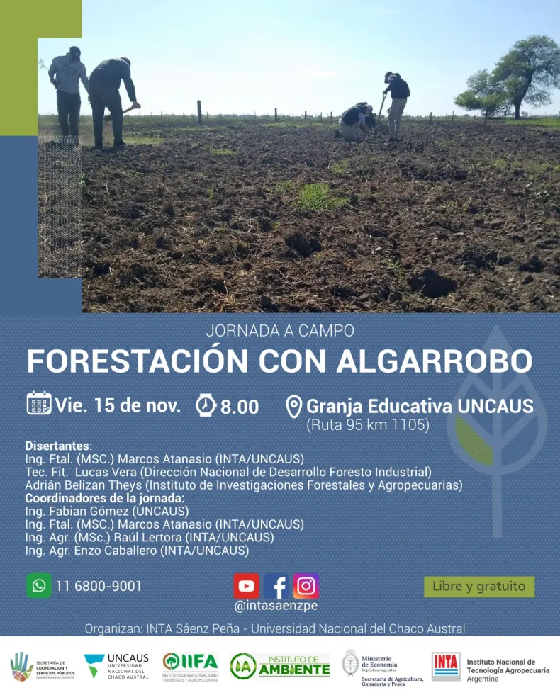 Las disertaciones estarán a cargo del Ing. Ftal. Marcos Atanasio (INTA/UNCAUS), Tec. Fit. Lucas Vera (Dirección Nacional de Desarrollo Foresto Industrial) y Adrián Belizan Theys (Instituto de Investigaciones Forestales y Agropecuarias). La actividad está coordinada por el Ing. Fabián Gómez (UNCAUS), Ing. Ftal. Marcos Atanasio (INTA/UNCAUS), Ing. Agr. Raúl Lertora (INTA/UNCAUS) y el Ing. Agr. Enzo Caballero (INTA/UNCAUS).