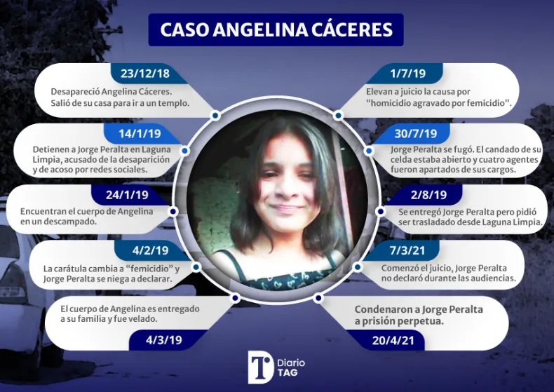 En enero, más precisamente el 14, detuvieron a Jorge Peralta en la localidad de Laguna Limpia, pero dónde estaba Angelina aún era una incógnita. Su familia realizó una marcha para reclamar la aparición con vida de la pequeña, una semana después de la movilización, la niña apareció, lamentablemente sin vida.