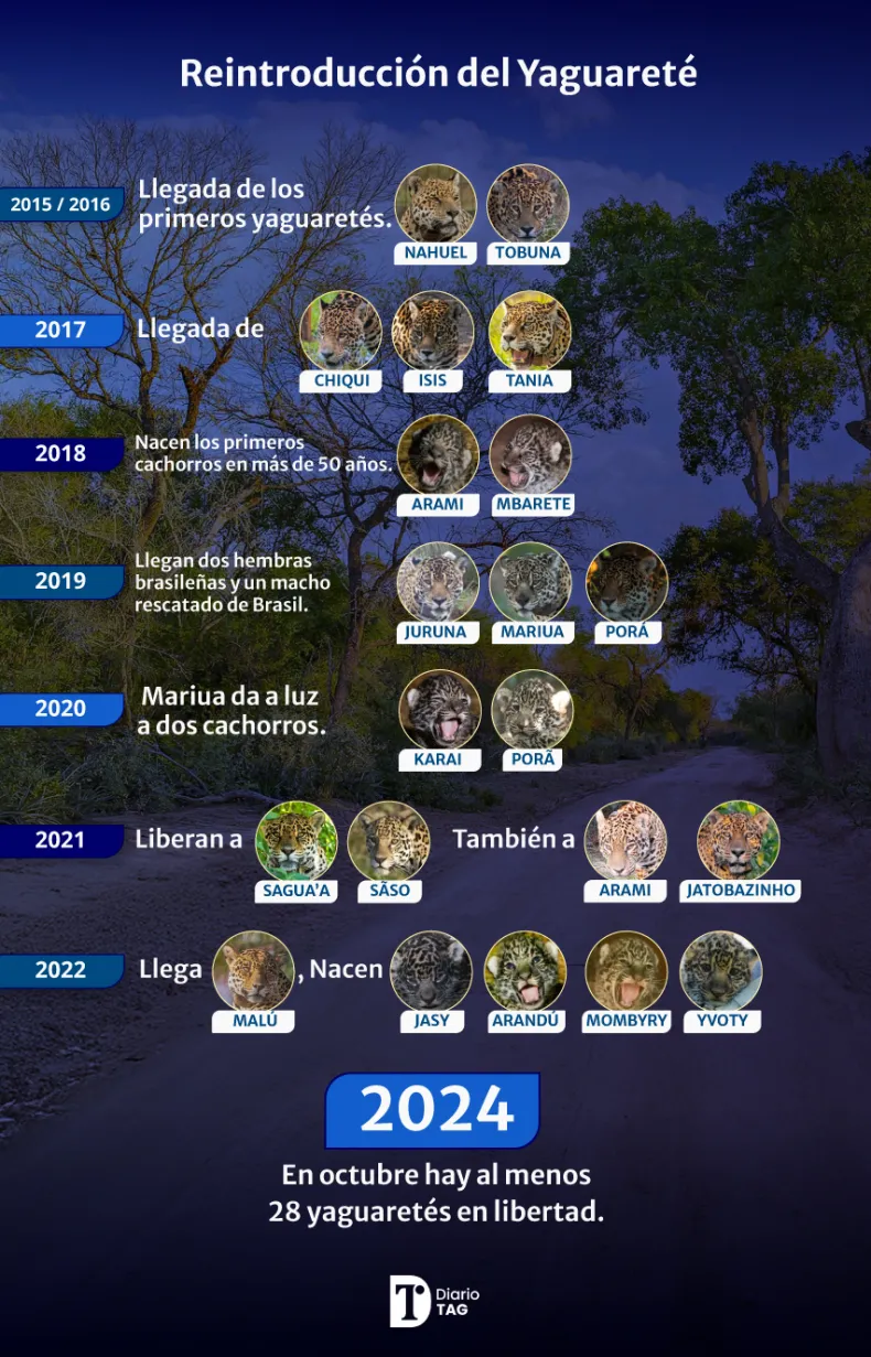El 2021 fue un año crucial, ya que se liberaron a los primeros yaguaretés en libertad, un hito que marcó el regreso de la especie tras más de 70 años de ausencia en Corrientes. Desde entonces, la población creció de manera sostenida, y a octubre de este 2024 ya se cuentan con al menos 28 yaguaretés viviendo libremente en los Esteros del Iberá, un número que demuestra la "vitalidad de la población".