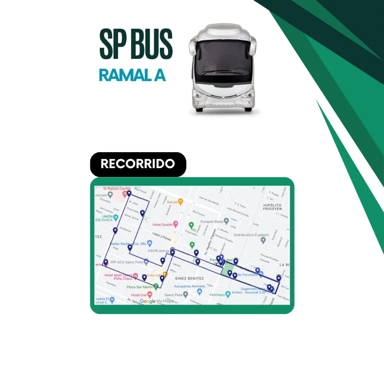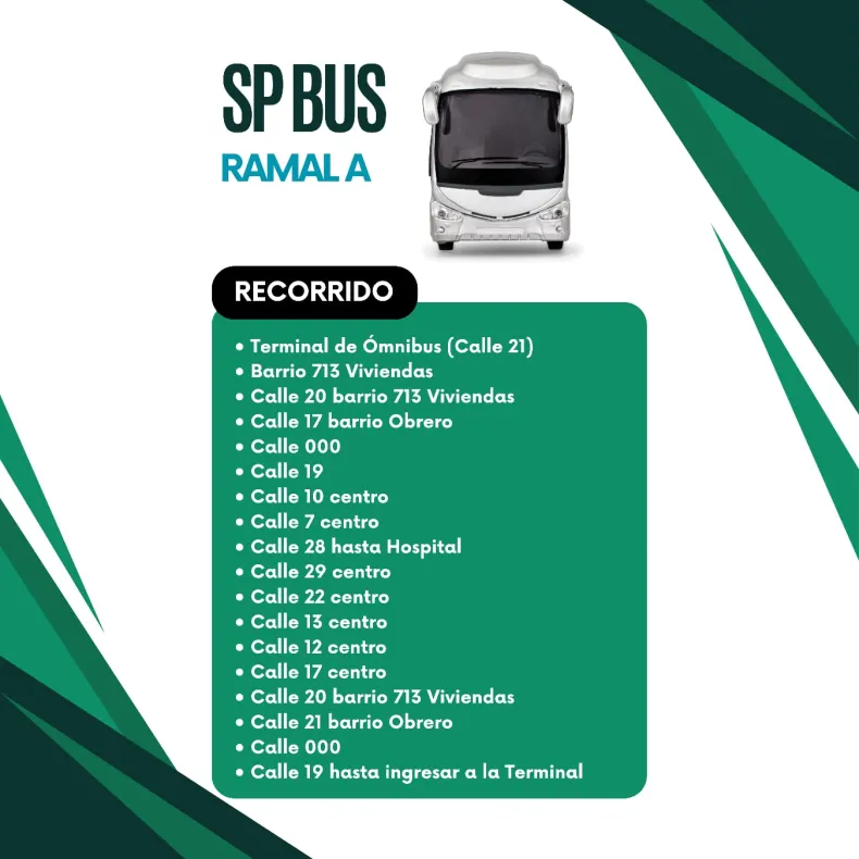 RAMAL A: Inicia en la Terminal de Ómnibus (Calle 21)- Barrio 713 Viviendas- Calle 20 barrio 713 Viviendas- Calle 17 barrio Obrero- Calle 000-Calle 19-Calle 10 centro-Calle 7 centro- Calle 28 hasta Hospital-Calle 29 centro- Calle 22 centro- Calle 13 centro-Calle 12 centro-Calle 17 centro-Calle 20 barrio 713 Viviendas- Calle 21 barrio Obrero- Calle 00- finaliza en Calle 19 hasta ingresar a la Terminal.