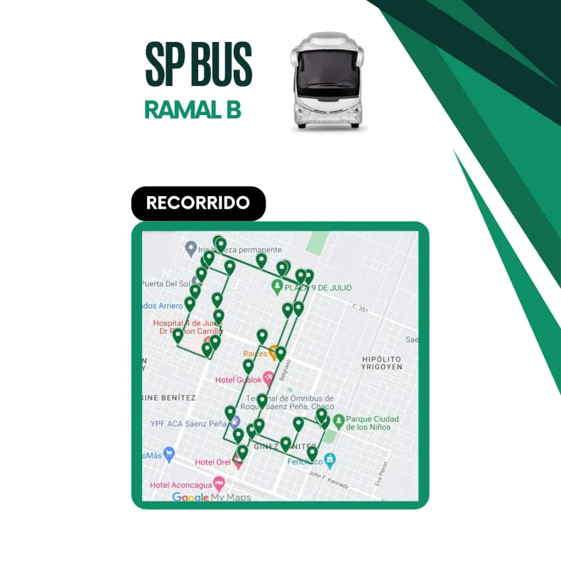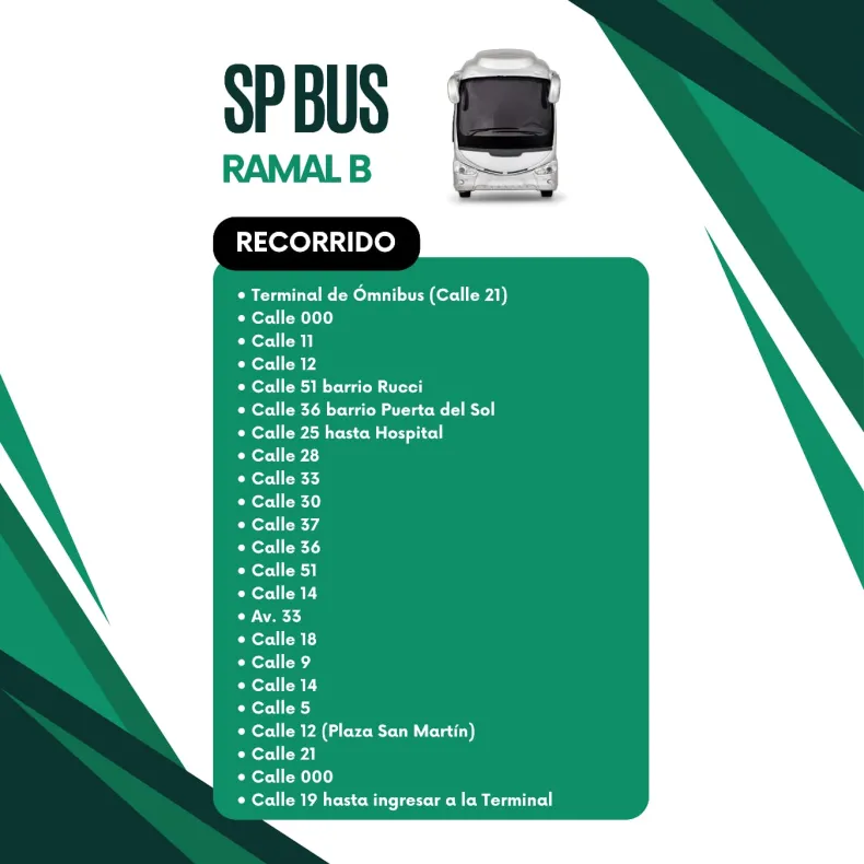 RAMAL B: Inicia en la Terminal de Ómnibus (Calle 21)- Calle 000- Calle 11- Calle 12- Calle 51 barrio Rucci- Calle 36 barrio Puerta del Sol- Calle 25 hasta Hospital- Calle 28-Calle 33- Calle 30- Calle 37- Calle 36- Calle 51- Calle 14- Αν. 33- Calle 18- Calle 9- Calle 14- Calle 5-Calle 12 (Plaza San Martín)- Calle 21- Calle 000- finaliza en Calle 19 hasta ingresar a la Terminal.