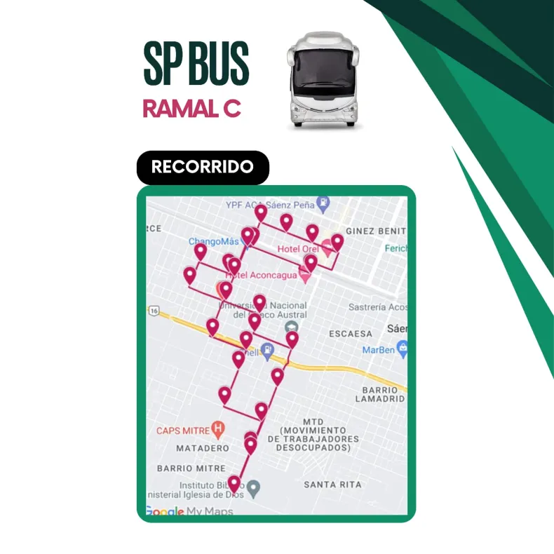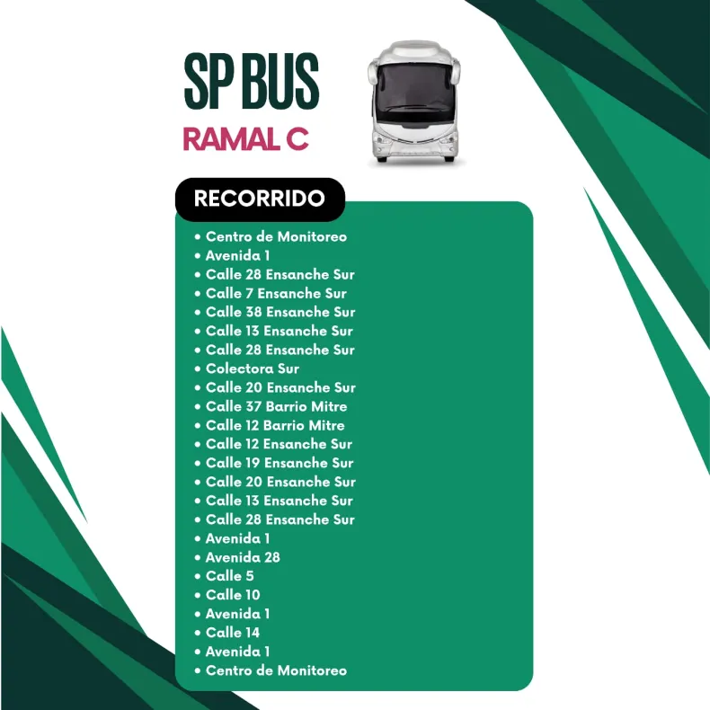 RAMAL C: Inicia en el Centro de Monitoreo- Avenida 1- Calle 28 Ensanche Sur- Calle 7 Ensanche Sur- Calle 38 Ensanche Sur- Calle 13 Ensanche Sur- Calle 28 Ensanche Sur- Colectora Sur- Calle 20 Ensanche Sur- Calle 37 Barrio Mitre- Calle 12 Barrio Mitre- Calle 12 Ensanche Sur- Calle 19 Ensanche Sur- Calle 20 Ensanche Sur- Calle 13 Ensanche Sur- Calle 28 Ensanche Sur- Avenida 1- Avenida 28- Calle 5- Calle 10- Avenida 1- Calle 14- Avenida 1- finaliza en el Centro de Monitoreo.