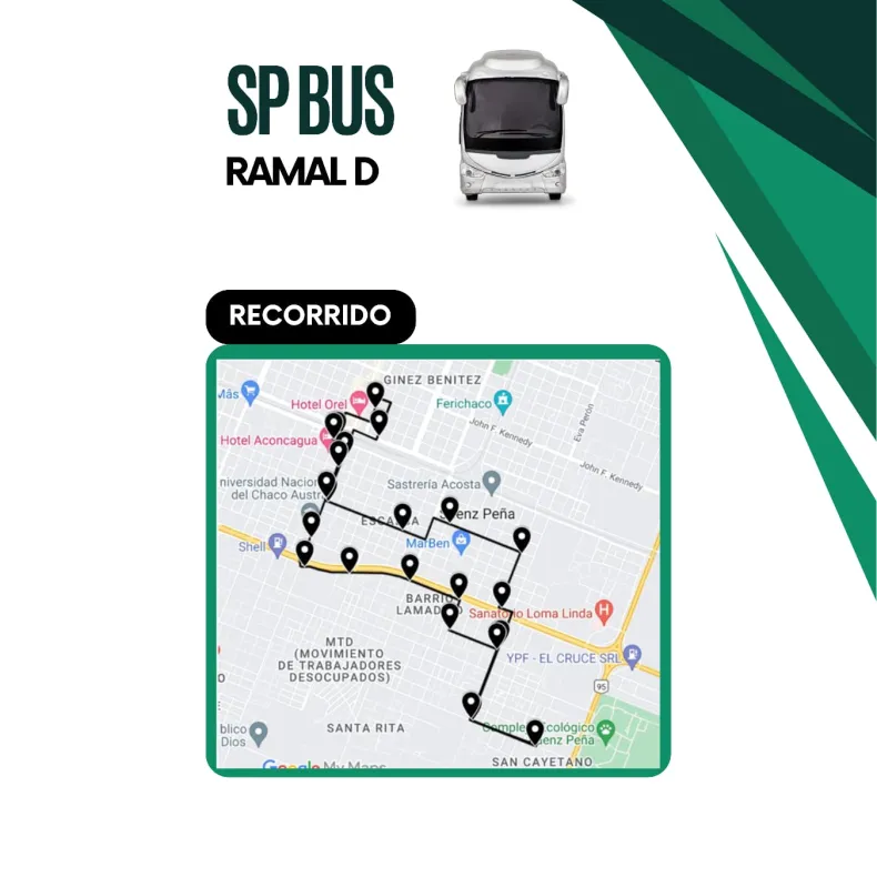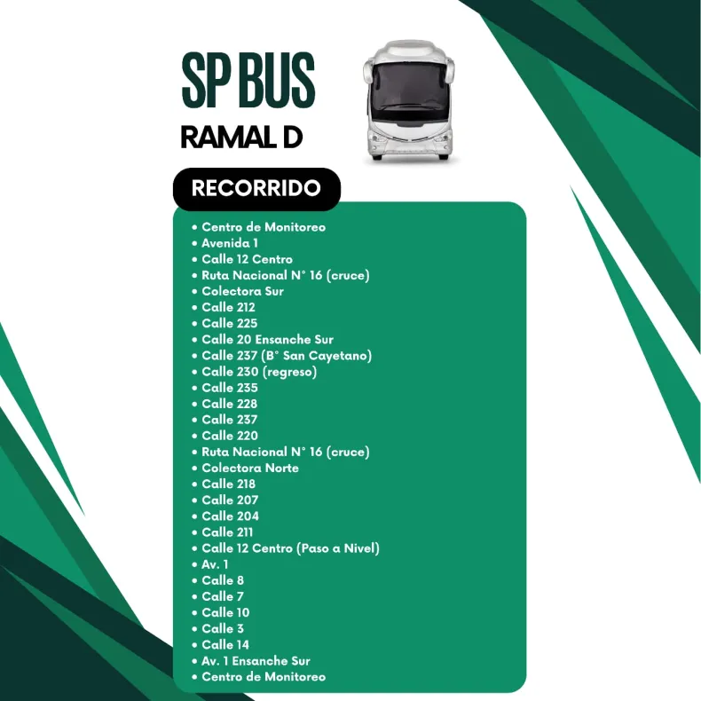 RAMAL D: Inicia en el Centro de Monitoreo- Avenida 1- Calle 12 Centro- Ruta Nacional N° 16 (cruce)- Colectora Sur- Calle 212- Calle 22- Calle 20 Ensanche Sur- Calle 237 (B° San Cayetano)- Calle 230 (regreso)- Calle 235- Calle 228- Calle 237- Calle 220- Ruta Nacional N° 16 (cruce)- Colectora Norte- Calle 218- Calle 207- Calle 204- Calle 211- Calle 12 Centro (Paso a Nivel)- Αν. 1- Calle 8- Calle 7- Calle 10-Calle 3- Calle 14- Av. 1 Ensanche Sur- finaliza en el Centro de Monitoreo.