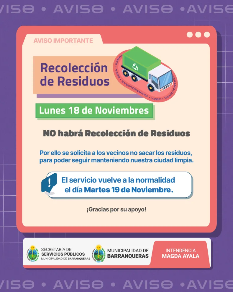 La Municipalidad de Barranqueras, a través de la Secretaría de Servicios Públicos, informa que este lunes 18 de noviembre no habrá recolección de residuos en la ciudad. Se solicita a los vecinos que no saquen los residuos para mantener la limpieza en las calles.