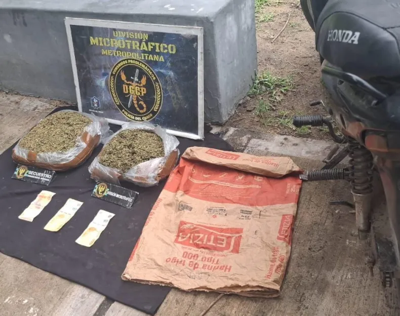 Sumado a la detención, se secuestraron: una bolsa de cartón contenía dos paquetes con marihuana con un peso total de 2,414 kilogramos, una motocicleta marca Appia modelo Cityplus 110 y $ 3.000 pesos.