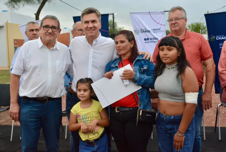 El gobernador Leandro Zdero, acompañado por el presidente del Instituto Provincial de Desarrollo Urbano y Vivienda (IPDUV), Fernando Berecoechea entregó, este martes, 72 viviendas a familias de Juan José Castelli. En ese contexto, acompañado también por el intendente local, Pío Sander, el primer mandatario provincial expresó: "Nos explota el corazón de alegría cuando sabemos que una familia accede a esa llave que es algo así como la llave del sueño, la llave de la felicidad".