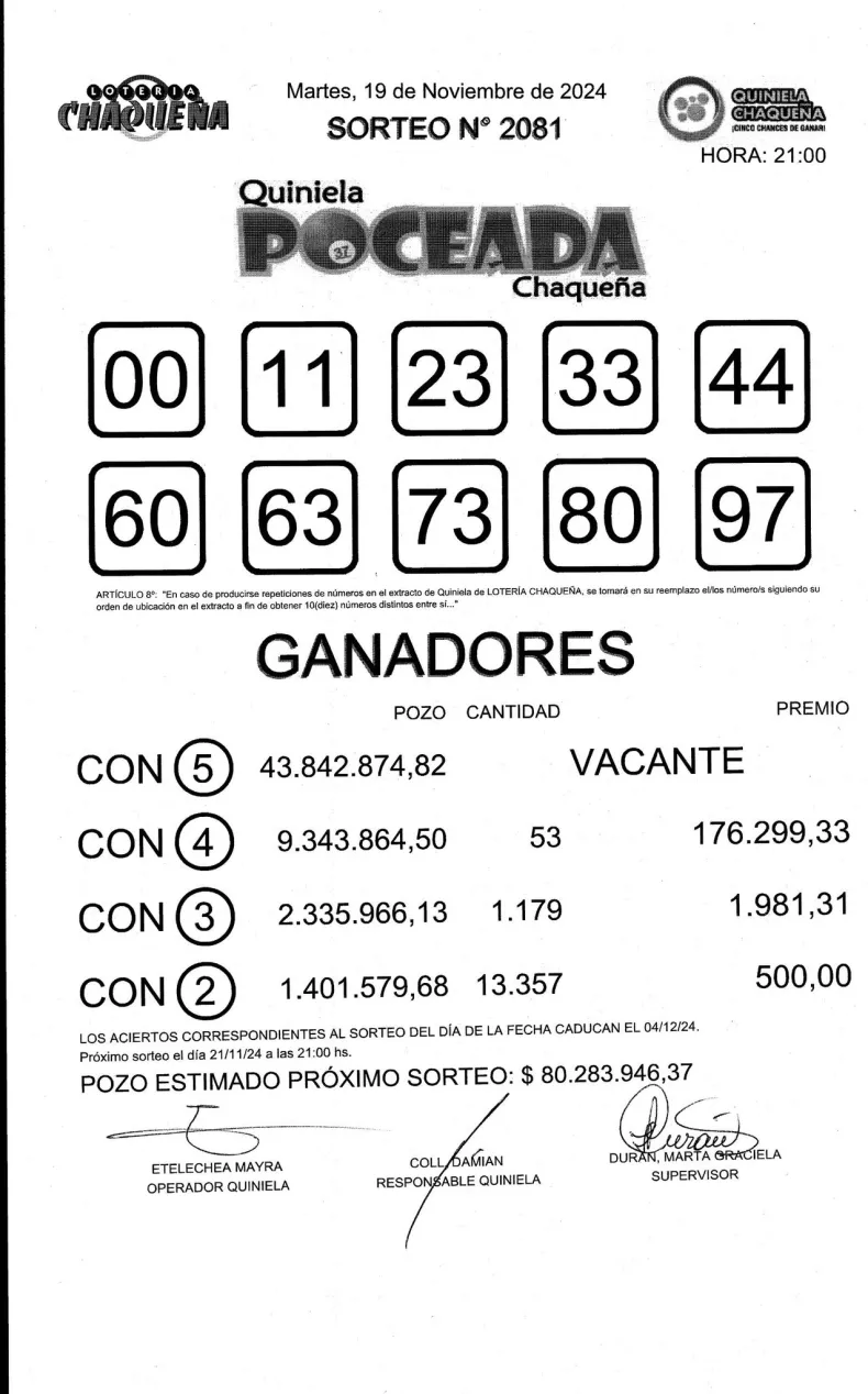 Se acumula el pozo y un chaqueño puede volverse millonario. En el sorteo del martes 19 de noviembre, ningún jugador obtuvo los cinco aciertos y el premio mayor quedó vacante. Ahora, este jueves 21 de noviembre se sortearán 80 millones de pesos a las 21 horas.