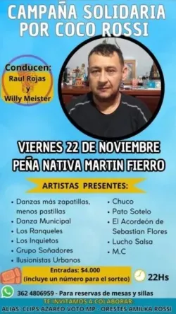 Este viernes 22 de noviembre se realizará la "Campaña Solidaria por Coco Rossi", a las 22 horas en la Peña Nativa Martín Fierro de la ciudad de Resistencia, donde se presentarán grupos de danza y músicos, la entrada tendrá un valor de 4 mil pesos y será valida para participar de un sorteo, el evento busca recaudar fondos.