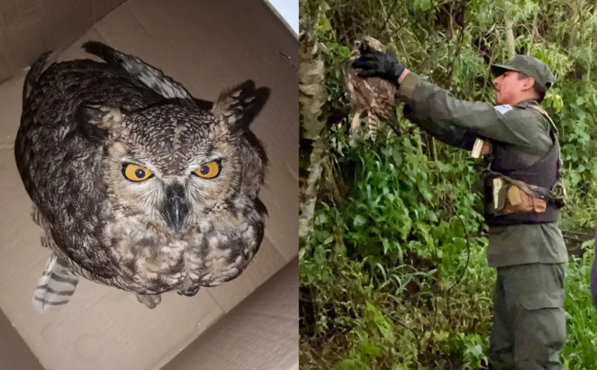 Cuando el personal arribó al lugar, constató la presencia de un ejemplar de búho real o americano (Bubo virginianus) que se encontraba desorientado, pero en buen estado de salud.