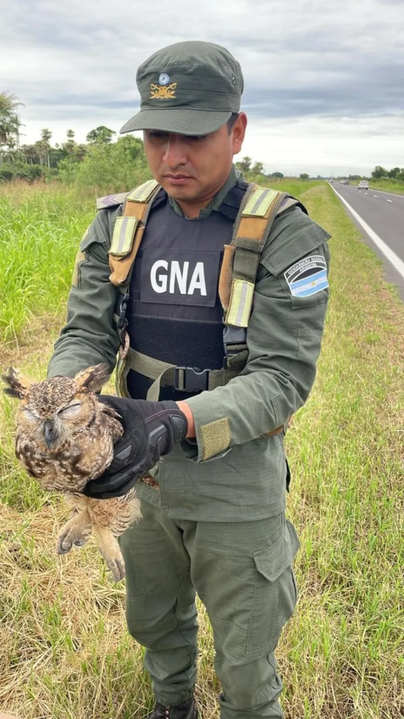Se trata de un búho real que fue rescatado por gendarmes en la banquina de la Ruta Nacional N° 11, cerca del kilómetro 1058.