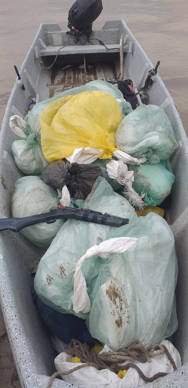 Además del estupefaciente, los efectivos incautaron una piragua con su motor, una escopeta recortada equipada con un láser, tres cartuchos calibre 32 sin percutar y un machete.