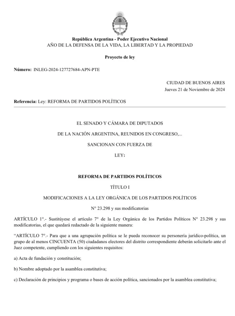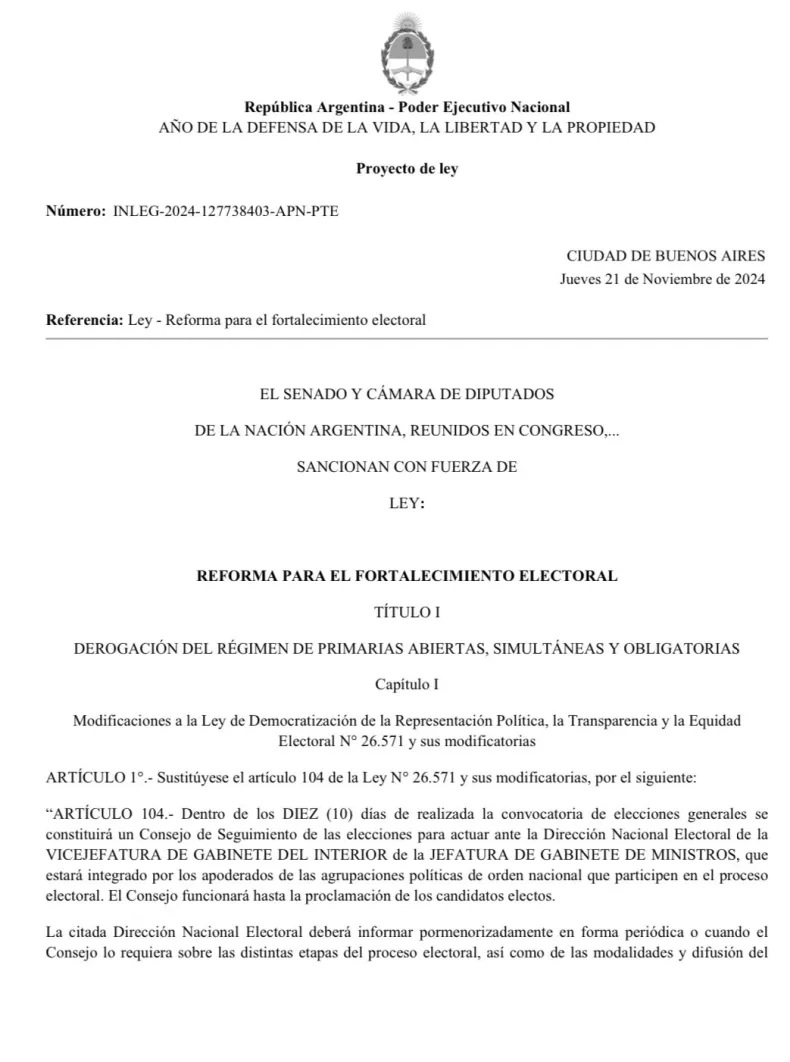 El mandatario detalló los tres puntos principales de la iniciativa: la eliminación de las PASO, la reestructuración del financiamiento de los partidos políticos y la reforma de la Ley Orgánica de Partidos Políticos. Asimismo, compartió el documento del proyecto.