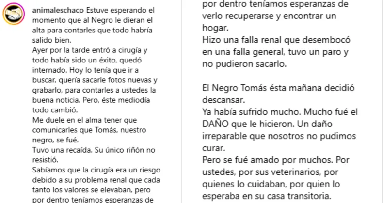 "Me duele en el alma tener que comunicarles que Tomás, nuestro negro, se fue. Tuvo una recaída. Su único riñón no resistió. Sabíamos que la cirugía era un riesgo debido a su problema renal, ya que cada tanto los valores se elevaban, pero por dentro teníamos esperanzas de verlo recuperarse y encontrar un hogar. Hizo una falla renal que desembocó en una falla general, tuvo un paro y no pudieron sacarlo", detallaron desde Animales Chaco.