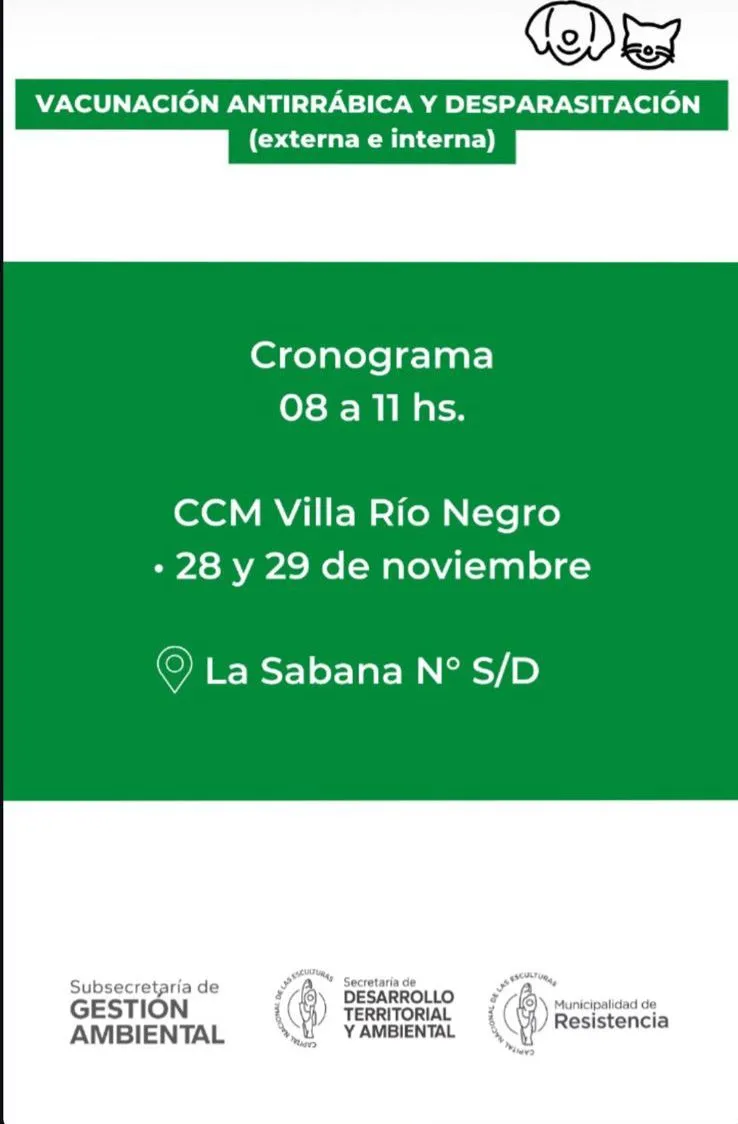A su vez, para este jueves 28 y viernes 29 de noviembre se realizará vacunaciones antirrábicas y desparasitación (externa e interna) también gratuitos en el Centro Comunitario Municipal Villa Río Negro ubicado en la calle La Sabana N° S/D de 8 a 11 horas.